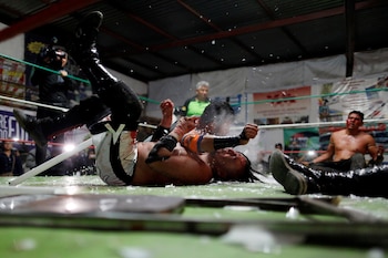 El luchador conocido como "Cíclope" se encuentra en el suelo después de perder una lucha extrema contra Los Malkriados, en un ring situado en un lavadero de autos en Tulancingo Hidalgo, México.