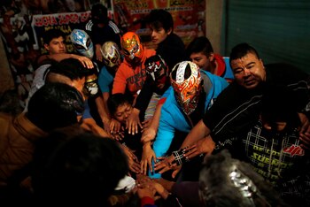 Los luchadores unen sus manos y se dan ánimo antes de subirse al ring en lo que será un nuevo espectáculo.