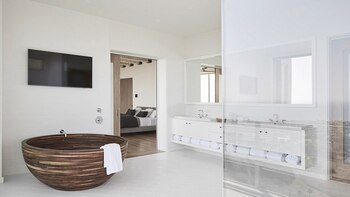 En la parte exterior hay una piscina de tres metros, que desemboca en una cascada.