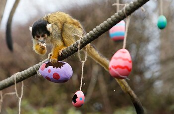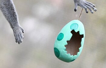 Un dragón de Comodo llamado Ganas trata de comer un huevo que le han dejado a su alcance para que se deleite