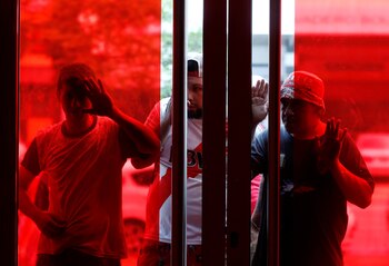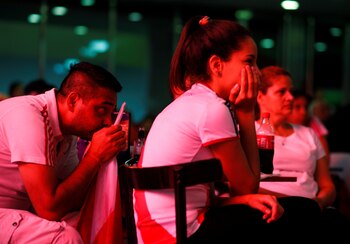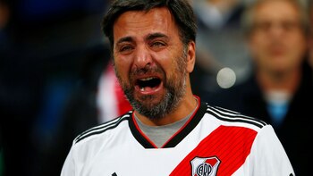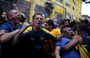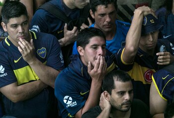 Los fanáticos de Boca Juniors en el barrio de La Boca de Buenos Aires reaccionan después de que su equipo pierde el partido de la segunda etapa de la final de la Copa Libertadores.