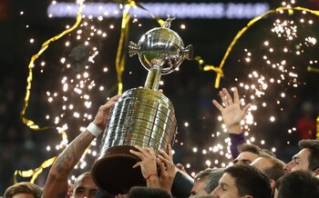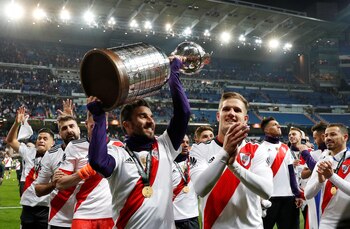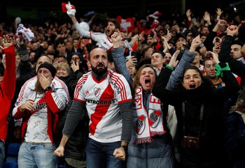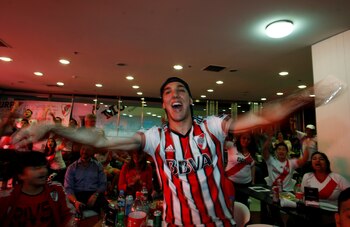 Los fanáticos de River Plate ven una transmisión de la Final de la Copa Libertadores en el River Museum.