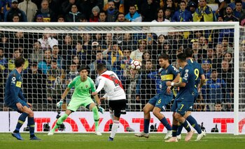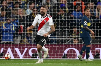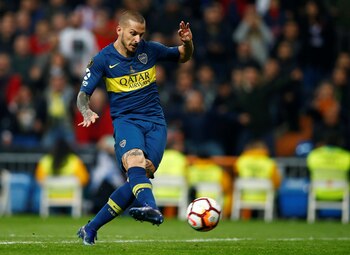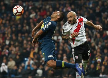 Nahitan Nandez de Boca Juniors en acción con Enzo Pérez de River Plate antes de que Dario Benedetto (L) de Boca Juniors anotara el primer gol del juego.