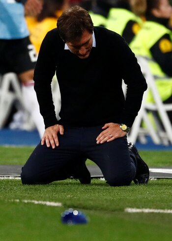 El entrenador asistente del Boca Juniors, Gustavo Barros Schelotto, se arrodilla tras la perdida de su equipo.