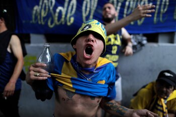 Fanáticos del Boca Juniors ven el juego desde un bar en el barrio La Boca en Argentina.
