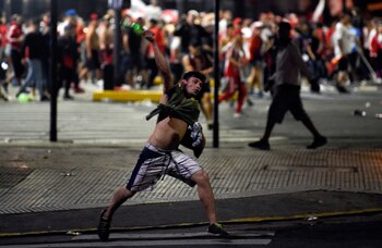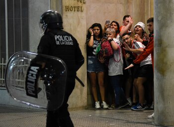 En la madrugada, la policía antidisturbios dispersó a los fanáticos de River Plate en la Plaza de la República en Buenos Aires, Argentina, después de que el equipo ganara la final de la Copa Libertadores argentina contra Boca Juniors en el estadio Santiago Bernabéu en Madrid, España, el 10 de diciembre de 2018. . (Foto por ALBERTO RAGGIO / AFP)