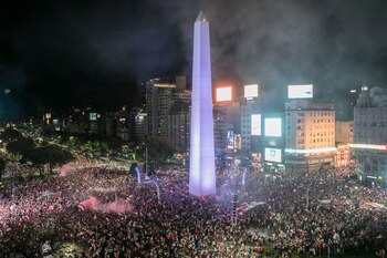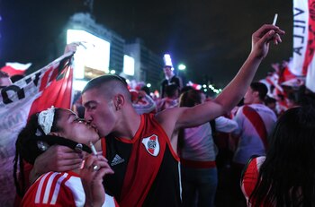 Un arco iris doble se arquea sobre el centro del Obelisco donde los fanáticos del fútbol de River Plate celebran la victoria de su equipo sobre el Boca Juniors 3-1 y el cierre del campeonato de la Copa Libertadores, en Buenos Aires, Argentina.