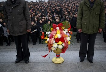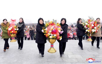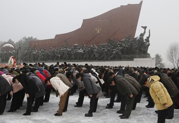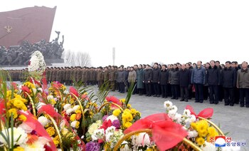 Los asistentes depositan flores en la base de las estatuas de bronce de sus difuntos líderes Kim Il Sung y Kim Jong Il en el Gran Monumento de Mansu Hill en Pyongyang.