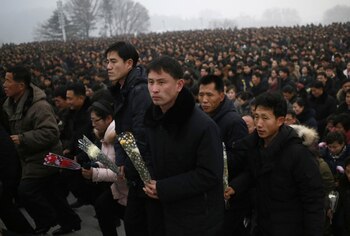 Los norcoreanos sostienen flores para colocarlas en las estatuas de bronce de sus últimos líderes.