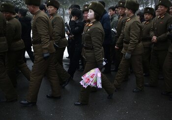 Una mujer miembro del ejército norcoreano sostiene flores para depositarlas en las estatuas de bronce de los difuntos líderes Kim Il Sung y Kim Jong Il en el Gran Monumento de Mansu Hill en Pyongyang, Corea del Norte, el lunes 17 de diciembre de 2018.