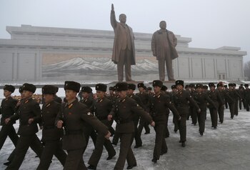 Los soldados norcoreanos y espectadores se van después de presentar sus respetos a las estatuas de bronce de sus difuntos líderes Kim Il Sung y Kim Jong Il en el Gran Monumento de Mansu Hill en Pyongyang, Corea del Norte, el lunes 17 de diciembre de 2018.