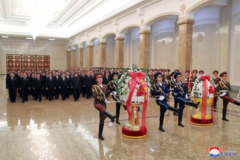 En esta foto proporcionada por el gobierno norcoreano, el líder norcoreano Kim Jong Un, sexto desde la izquierda, visita el Palacio del Sol de Kumsusan, donde descansa el cuerpo del difunto líder Kim Jong Il, en Pyongyang, Corea del Norte, el lunes 17 de diciembre de 2018.