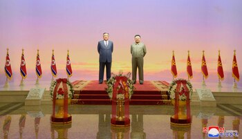 Un adorno floral con el nombre del sucesor y actual líder, Kim Jong Un, también fue expuesta frente a las estatuas.