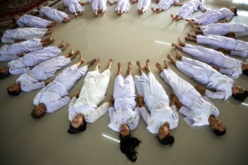 Con túnicas blancas oran durante una ceremonia masiva de ordenación de mujeres monjes novicias budistas en el monasterio Songdhammakalyani, provincia de Nakhon Pathom, Tailandia, el 5 de diciembre de 2018.