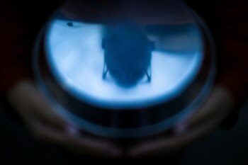La cara de una mujer monje novicia se refleja en un cuenco cuando recibe ofrendas de alimentos de personas en la provincia de Nakhon Pathom, Tailandia, el 7 de diciembre de 2018.