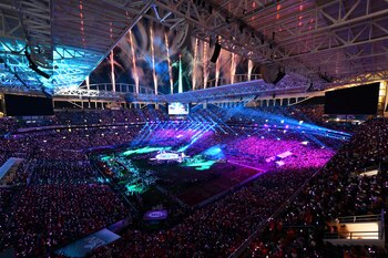 Una multitud de bailarines, cerca de 3.000, se sumó al campo de juego para armar una coreografía multitudinaria.