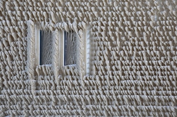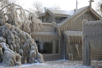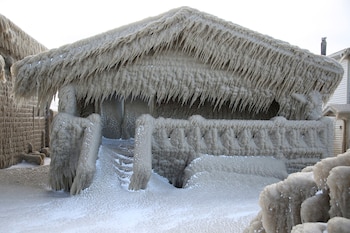 El paseo marítimo de Hoover Beach en Hamburgo, Nueva York, se ha transformado en una visión mágica. Las casas están envueltas en una gruesa capa de hielo, con estalactitas colgando de los marcos de las puertas, toldos y tejados.