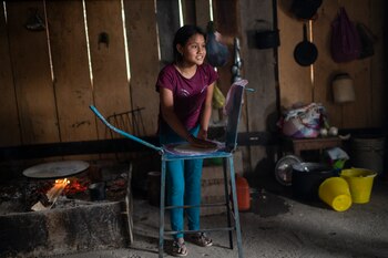 Maurilia amasa y pone al comal grandes tortillas de maíz, principal alimento de su familia. En la choza de piso de tierra, su hija de 18 años con su bebé en brazos y sus nietas escuchan.