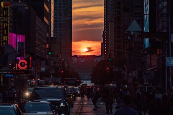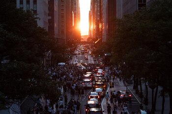 Inmortalizar el “Manhattanhenge”, momento en el que el sol se pone verticalmente entre los rascacielos de Nueva York, era el objetivo de miles de personas este lunes, y para conseguir esta fotografía poco les importó situarse en mitad del tráfico de las ajetreadas avenidas de la Gran Manzana o plantar su cámara con horas de antelación.