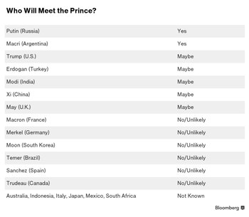 Others, particularly from western democracies, are more likely to shun him. Officials in France, Germany and Canada say their leaders would be unlikely to meet him even if he asks. British Prime Minister Theresa May's office declined to say whether she would hold a bilateral meeting with the prince.