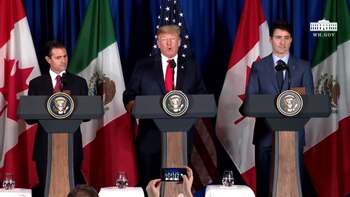 Pena Nieto is on the last day of his presidency. Notes that the 3 countries 'are ready to begin a new chapter in our shared history. The 3 leaders are now sitting down to sign the directive documents for the renegotiated NAFTA.