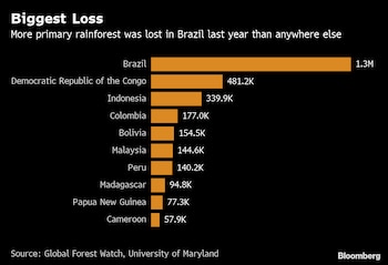 La mayor pérdida de terreno de bosque tropical primario el año pasado se registró en Brasil, donde desaparecieron aproximadamente 1,35 millones de hectáreas, seguida por la República Democrática del Congo, Indonesia, Colombia y Bolivia.