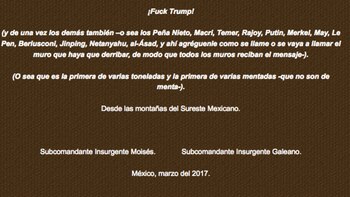 El final de su mensaje el EZLN lanza una clara dedicatoria al presidente de Estados Unidos, Dondal Trump con la expresión ¡Fuck Trump¡, la que también hace extensiva a otros mandatarios.