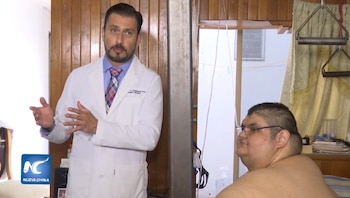 Franco tiene 33 años, vive en Aguascalientes, México y pesaba 590 kilos. Lo atienden diez médicos y gracias al tratamiento al que se sometió ha logrado hasta hoy bajar 218 kilos.