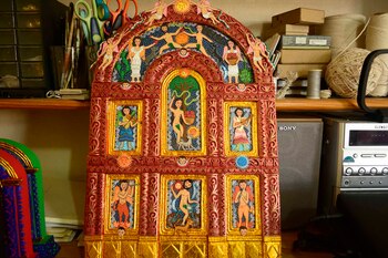 Para crear una pieza de 37 por 48 centímetros le basta una hora y media si el diseño es sencillo y hasta 3 cuando requiere más detalles. Los retablos, en cambio, le llevan entre 15 y 20 días y a veces 3 o 4 meses.