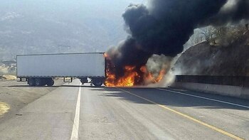 Después, el chofer del camión coloca el vehículo en medio de la carretera y el joven que dirige la operación le exige que se baje, insultándolo y amenazándolo con su arma. Otro sujeto, mientras tanto, sosteniendo una bomba molotov, le prende fuego al camión y huye a bordo de la pick up blanca.