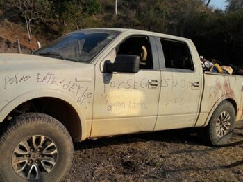 Todos eran hombres con huellas de tortura y bala en sus cuerpos. La camioneta rotulada como unidad de la Marina estaba cubierta con mensajes escritos a mano, con advertencias y amenazas de integrantes de la delincuencia organizada.
