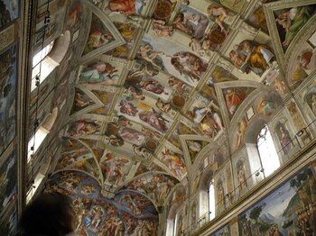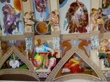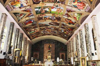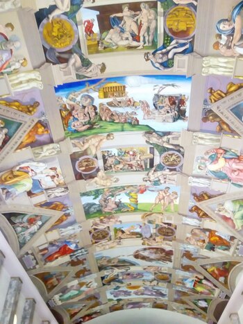 En realidad, son lienzos pintados con acrílico, colocados en el techo de esta iglesia con pegamento de papel tapiz, que imitan los 14 frescos de la obra de Miguel Ángel en la Capilla Sixtina de la ciudad de El Vaticano.