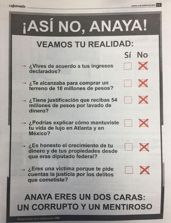 El PAN interpuso la queja contra el PRI, su candidato José Antonio Meade y otros, por la difusión del desplegado "Así no, Anaya", que generó una percepción negativa del candidato frente a la ciudadanía.