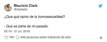 "¿Que qué opino de la homosexualidad? Que es parte de mi pasado", escribió en un polémico tweet.