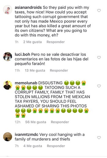 Sin embargo, en otras, donde sí tiene activada la sección, hay una serie de críticas negativas que van desde decirle al tatuador que debería sentirse avergonzado hasta las que le cuestionan si le pagaron con los impuestos de los mexicanos.