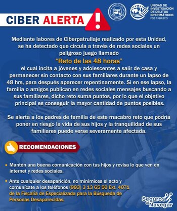 La Fiscalía General del Estado de Tabasco, México, publicó una alerta sobre el peligroso reto viral llamado "Reto de las 48 horas", que incita a los jóvenes eliminar contacto con sus familiares durante ese periodo de tiempo.