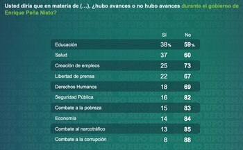 La mayoría de los mexicanos además percibe escasos avances en los principales temas durante el sexenio que termina, particularmente en combate a la corrupción, lucha contra el narcotráfico y en economía.