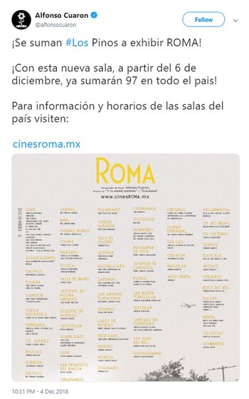 "Se suman Los Pinos a exhibir 'Roma'! ¡Con esta nueva sala, a partir del 6 de diciembre, ya sumarán 97 en todo el país!", celebró este miércoles el director ganador del Oscar.