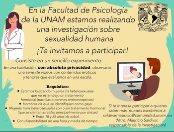 La Facultad de Psicología de la Universidad Nacional Autónoma de México (UNAM) lanzó una convocatoria para reunir hombres y mujeres de entre 18 y 35 años para evaluar videos con contenido erótico y sexual.