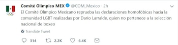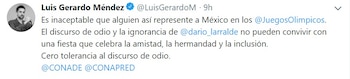 "Es inaceptable que alguien así represente a México en los @JuegosOlimpicos. El discurso de odio y la ignorancia de @dario_larralde no pueden convivir con una fiesta que celebra la amistad, la hermandad y la inclusión. Cero tolerancia al discurso de odio", publicó Luis Gerardo Méndez.
