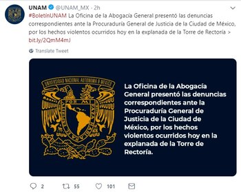 Por su parte, la UNAM informó a través de un comunicado difundido en redes sociales que la Oficina de la Abogacía General presentó las denuncias ante la Procuraduría General de Justicia de Ciudad de México por las lesiones causadas a un miembro de la comunidad académica, así como por los daños ocasionados al patrimonio universitario durante los hechos ocurridos en la Torre de Rectoría.