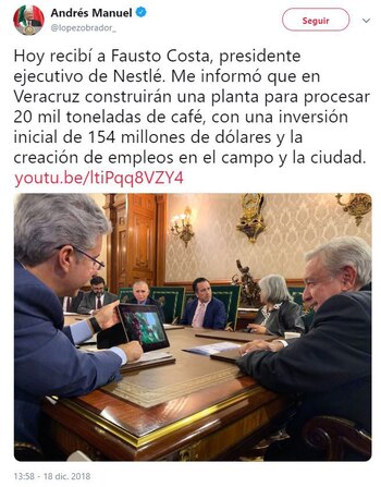 La primera gran inversión en el Gobierno de Andrés Manuel López Obrador fue concretada por la empresa multinacional Nestlé, que anunció la construcción de una planta procesadora de café en el estado de Veracruz.