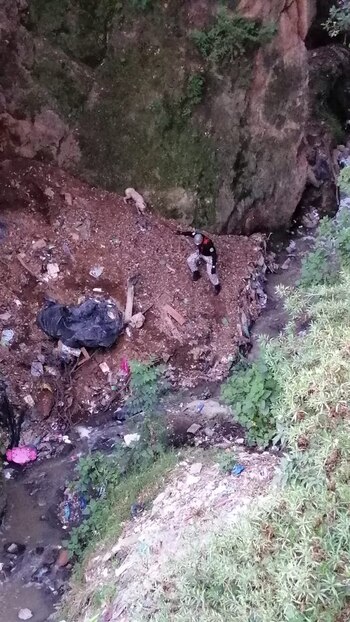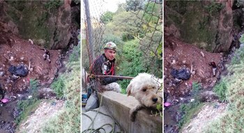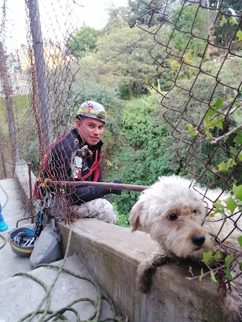 Al percatarse de que estaba vivo y en el fondo del barranco la mujer llamó a las autoridades, por lo que la Brigada de Vigilancia Animal acudió al rescate y un brigadista tuvo que descender aproximadamente 35 metros para subirlo.