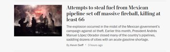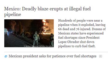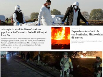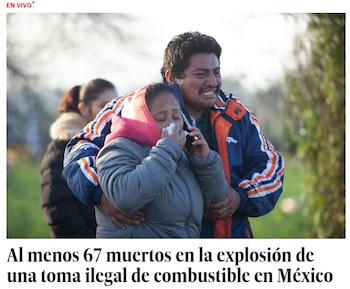 "Cientos de personas estaban cerca del ducto cuanto este explotó, dejando 66 muertos y 76 heridos. Docenas de estados mexicanos han sufrido escasez de combustible desde que el Presidente López Obrador cerró las tuberías para frenar el robo de combustible" explica el diario a sus lectores.