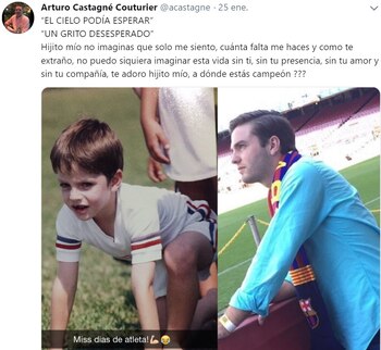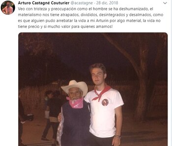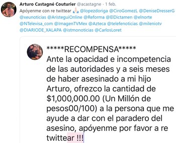 A través de su cuenta de Twitter, Arturo Castagné Couturier indicó que ofrece una recompensa luego de que autoridades del Estado de Puebla y de la actual Fiscalía General de la República "no han ofrecido resultados" a seis meses de ocurrido el crimen de su hijo Arturo Castagné Thomas.