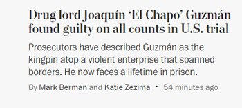 "El señor de las drogas Joaquín "El Chapo" Guzmán fue hallado culpable de todos los cargos en el juicio de los Estados Unidos" relata el titular de The Washington Post.