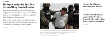 "El Chapo condenado en un juicio que reveló la brutalidad de su cártel"; "Aquí están las 11 revelaciones más grandes del juicio"; y "Las diez semanas de testimonio sugirieron que el muro del Presidente Trump haría poco para detener el tráfico de drogas" son las tres notas que redactó el diario estadounidense.