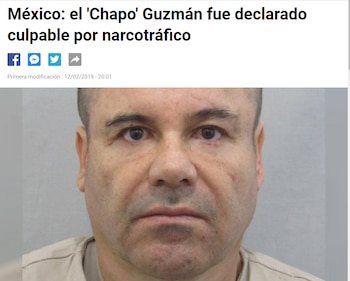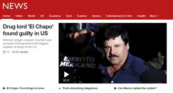 "El señor de la droga 'El Chapo' hallado culpable en Estados Unidos" dice el título de su artículo principal. "El capo mexicano Joaquín Guzmán fue acusado de estar detrás del mayor proveedor de drogas de Estados Unidos" reza el extracto.