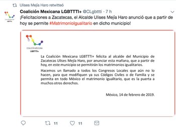 En su cuenta de Twitter, el edil compartió el video de su anuncio, donde reiteró: "Desde hoy en #Zacatecas serán bienvenidos los matrimonios igualitarios, una exigencia justa a la que respondemos con acciones contundentes".