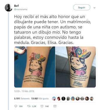 "Hoy recibí el más alto honor que un dibujante puede tener. Un matrimonio, papás de una niña con autismo, se tatuaron un dibujo mío", explicó en Facebook y Twitter.